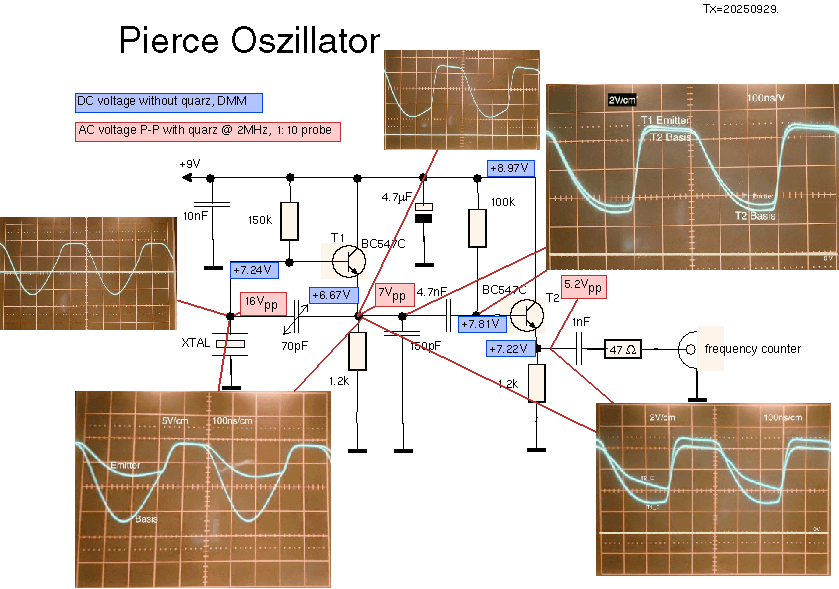 T2 macht in dieser Schaltung nicht viel, er entkoppelt nur den Oszillator von der Belastung durch den Frequenzzähler, wie man im Oszillogramm rechts unten sieht: hier ist der Emitter von T1 und der Emitter von T2 gezeigt. Diese Belastung erzeugt dann auch die unschöne Form des Ausgangssignals -- der Emitterwiderstand von T2 müsste kleiner sein, um das Koaxkabel zum Zähler schnell genug entladen zu können. Bei abgestecktem Frequenzzähler sind beide Signale praktisch identisch, wobei das T2 Emitter-Signal nicht ganz bis auf 9V hochkommt, weil die 0.6V der Basis-Emitter-Strecke fehlen.