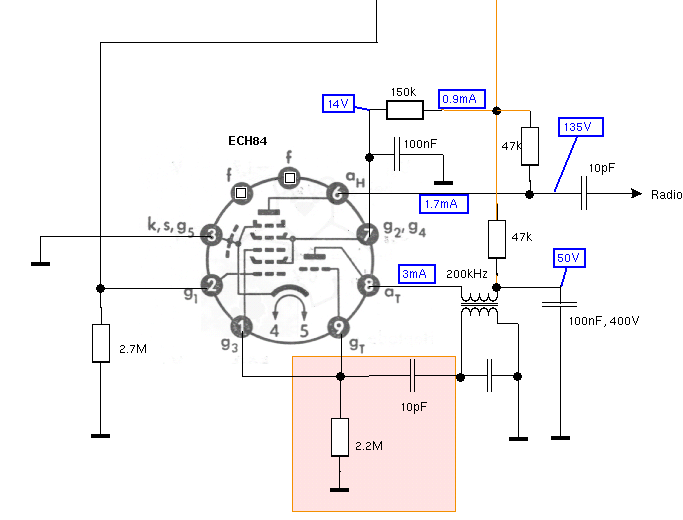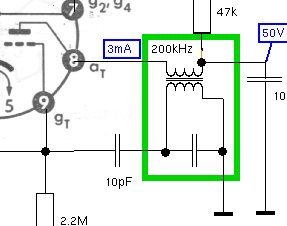 Die Triode soll als Oszillator auf ca. 200kHz arbeiten. Leider kam mit einem gelben 455kHz ZF-Filter (mit zusätzlichem Schwingkreiskondensator, f0 = 200kHz) keine Schwingung zustande. Natürlich wurde auf die richtige Phasenlage geachtet (mit Oszi ausgemessen) und aus Verzweiflung auch die andere Phase (erfolglos) versucht. Da das ZF-Filter im Schwingkreis eine Anzapfung bot, wurde auch diese erfolglos probiert. Ebenso wurde der Schwingkreis sowohl beim Gitter als auch bei der Anode probiert. Die verwendete Schaltung ist die Meißner-Schaltung, bei der ein Transformator die Rückkopplung und die Phasendrehung vornimmt.