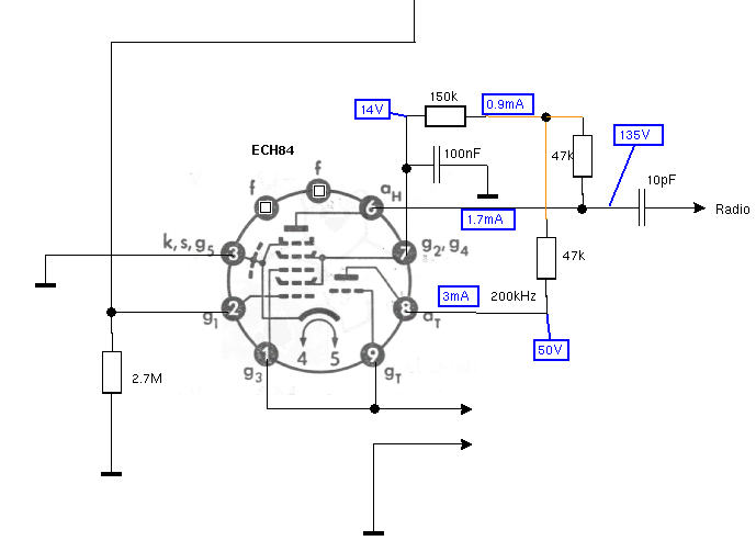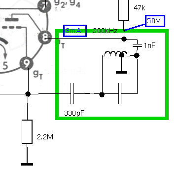 Sowohl die Gittervorspannung als auch die 200kHz Schwingung beziehe ich aus dem Funktionsgenerator, der einen geringen Innenwiderstand hat und so die Spannungsverhältnisse am Gitter festzementiert. Im Anodenkreis ist nur noch der 47k