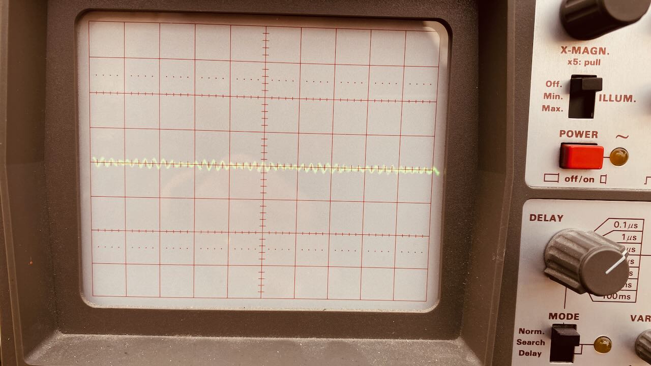Es ist jetzt noch ca. 2 mVpp 50 Hz Brumm vorhanden, der sich aber nun ausfiltern lassen sollte. Im Bild sind es 5mV/cm.