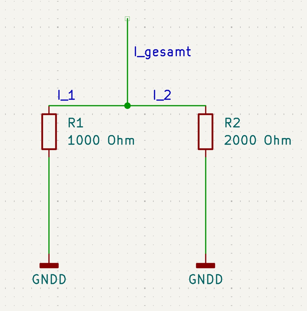 Wenn also durch R1 der Strom I1 fliesst und durch R2 der Strom I2, dann fliesst nach oben die Summe aus I1 und I2, also