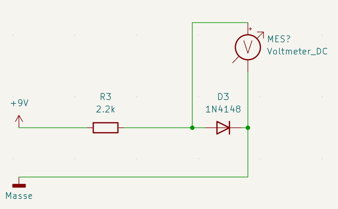 Eine Spannungsmessung wird immer parallel zum Bauteil vorgenommen. Wollen wir also z.B. die Spannung an der Diode (oder an der LED oder am Glühlämpchen) wissen, so schalten wir das Voltmeter parallel dazu, damit es den "Druck", die Spannung, die an dem Bauteil anliegt, messen kann: