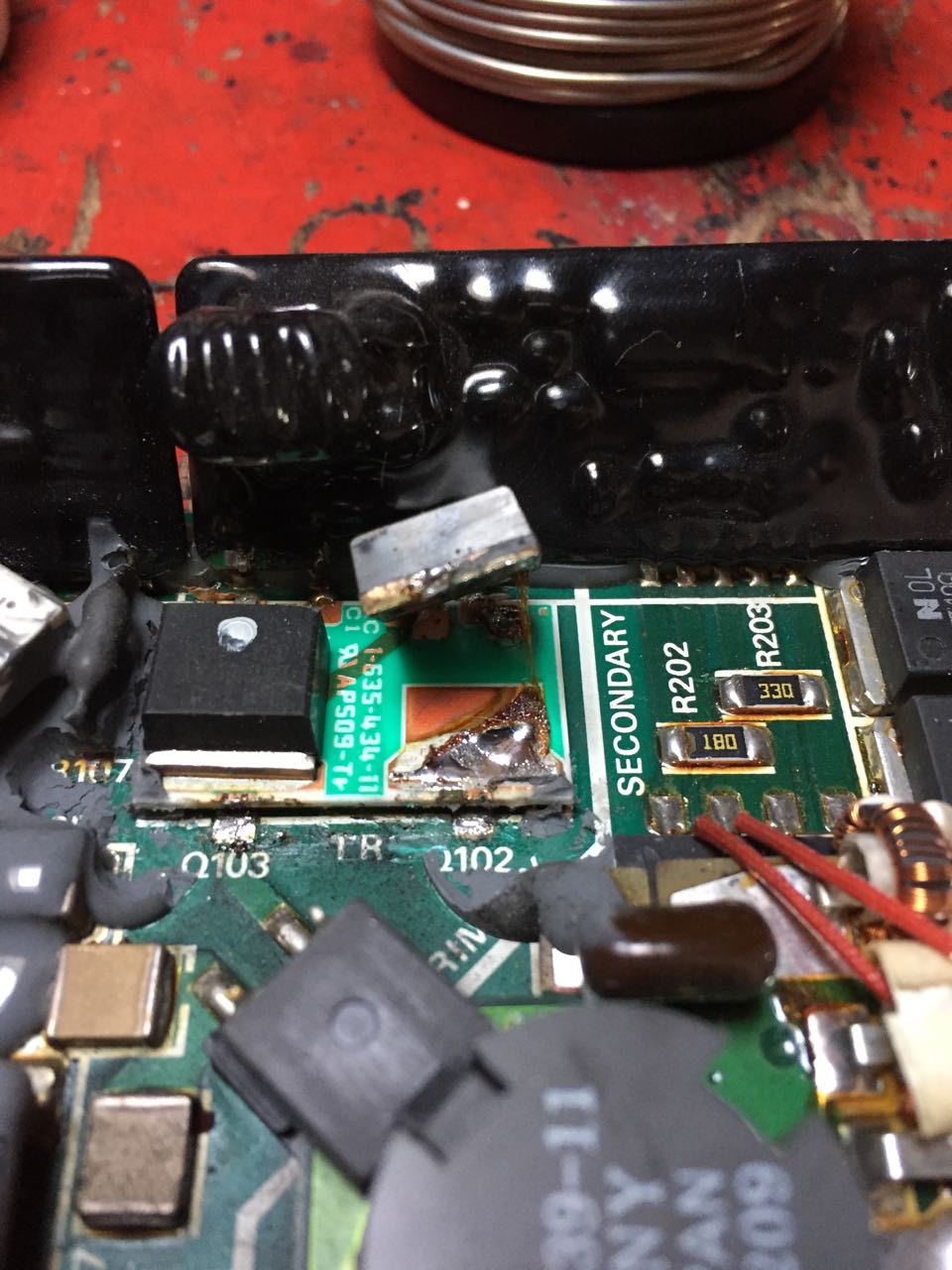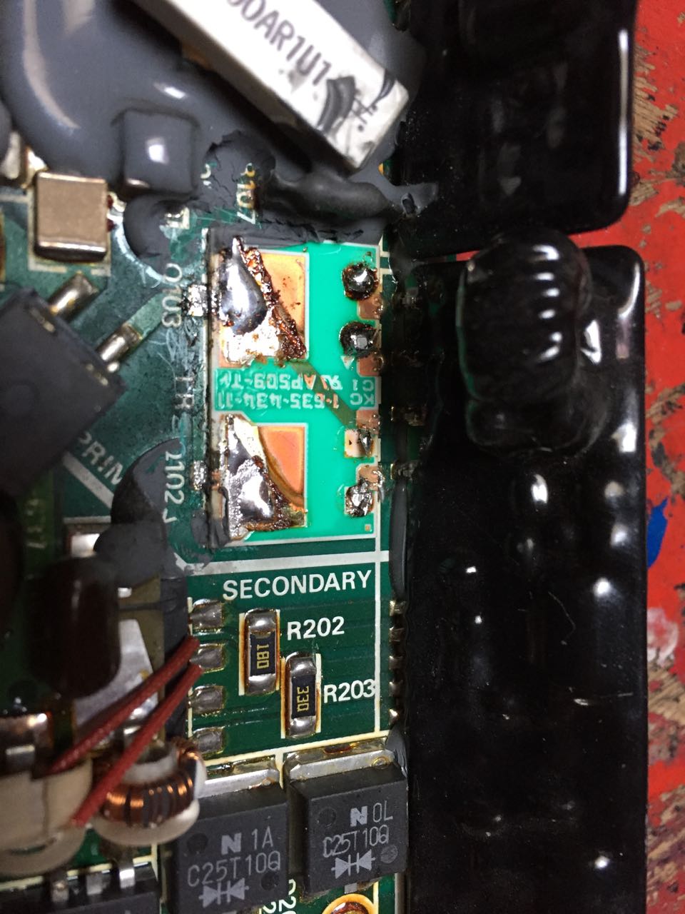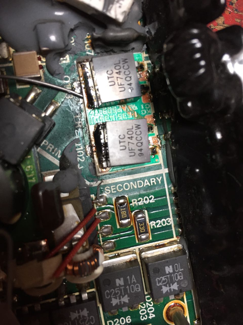 3. In my view the power supply is built very shitty and its construction makes repairs very hard: There are 4 PCBs inside, one even attached to the top cover! One of the PCBs is the aluminum ground plate; due to its (intentional) high heat conductivity it is almost impossible to solder on it with a normal (60 Watts) soldering iron. In addition there are 4 thick-film circuits, which are sealed with thick, black stuff. And most of the circuity is covered with ugly grey stuff which is very hard to get off (and you have to remove it to exchange parts). And then several parts (resistors) are GLUED in various places. Argghh.