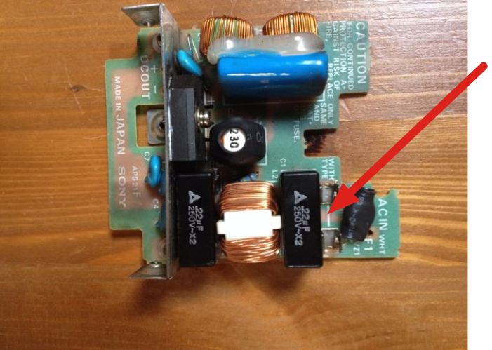 5. The PCB closest to the 110/220V connector (I will call it the "line board") holds the fuse (red arrow, fuse is missing in picture), some capacitors, and the rectifier. The fuse is usually blown and needs to be replaced.