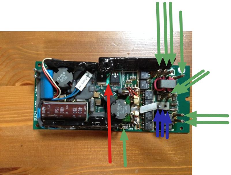 Well, I have done this now to two power supplies (PS), but I was not as lucky on the second one: there is an active power factor correction circuit in there as well. And the diode is likely to also get shot (short circuit) when the MOSFETs go. This was the case here. You see the red arrow pointing to the defective diode. I had to clip it where the green arrow points to.