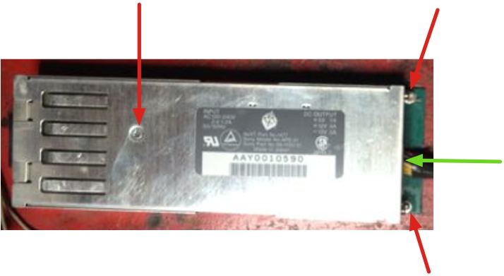 6. The rectified 110V/220V voltage is then routed through a black (minus) and red (plus) wire (or through two metal posts) to the main circuit board. If not already done, de-solder these wires (see red arrows above) from the line board to be able to further disassemble the power supply.