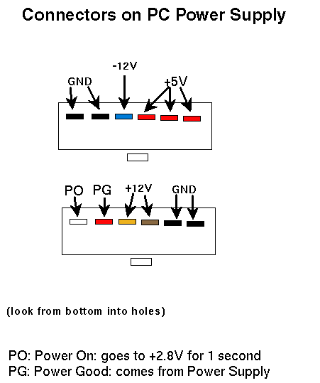 Please note: all the colors mentioned in the drawings are as I found them on my black&white NeXTstation. On PC power supplies the color coding may vary: on PC supplies the +5V is usually run through red wires and the +12V through yellow wires (just opposite as on the NeXT and opposite to the drawing)!! You have to use caution and common sense (and a volt-meter!) to make sure you connect the correct voltages to the correct pins on the NeXT - don't simply rely on the colors of the wires!