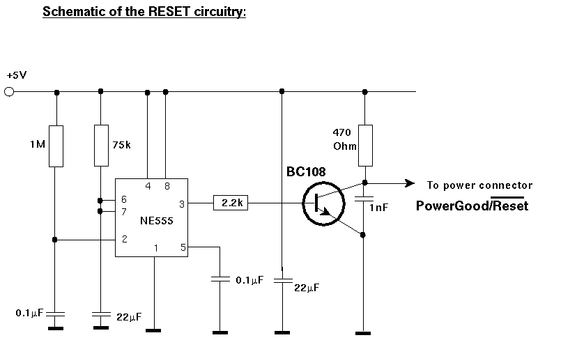 The one thing left is the PowerGood pin of the NeXT. I tried connecting it to the PowerGood outlet of my new power supply but it did not work. The NeXT expects a long (1 sec) low signal here while the PC power supply sets PowerGood to high much too fast. I am still working on this, but I hope that a simple 555-reset timer will be good enough. ...YES, indeed I tested it and it works just fine! Have a look at the circuit diagram (also as GIF if you can't handle tiff!).