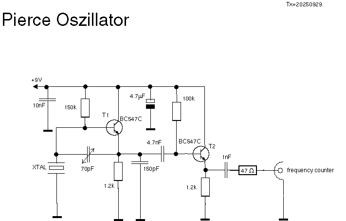 Die Schaltung stammt, leicht abgewandelt, von MCL auf Patreon (pay wall!), man findet ähnliche Schaltungen aber leicht an verschiedenen Stellen im i-net. Der Quartz wird in Parallelresonanz betrieben, hat also bei Resonanz eine sehr hohe Impedanz. Das unvermeidliche Rauschen in der Schaltung regt den Quartz zu mechanischen Schwingungen an, die dann an der Basis von T1 anliegen. T1 arbeitet als Emitterfolger, hat also einen hohen Eingangswiderstand (ca. 150 kOhm) und belastet daher den Quartz kaum. Am Emitter können wir die Schwingung niederohmig auskoppeln. Damit die Schwingung aber nicht wieder aufhört, bedarf es einer Rückkopplung, die über den 70 pF Trimmer erfolgt. Da zwischen Emitter und Basis keine Phasenverschiebung existiert, können wir das Signal einfach so zurückkoppeln.