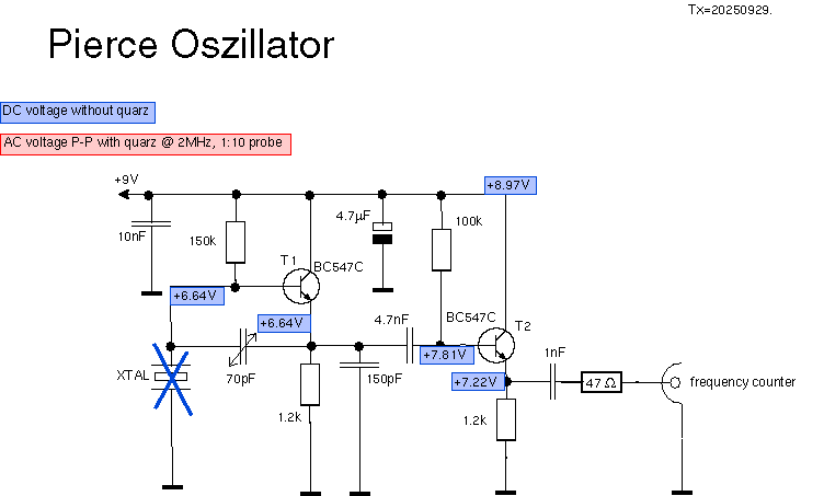 Betrachten wir erst mal die Gleichspannungsverhältnisse ohne Quartz (blau). Diese Messwerte haben mich Tage beschäftigt: Basis und Emitter von T1 zeigen die gleiche Spannung!! Bei T2 passt dagegen alles, hier sind es ca. 0.6V Unterschied. Was ist da los?? Ich hatte schon wilde Schwingungen (ohne Quartz) vermutet, aber mit dem Oszi war nichts zu sehen. T1 defekt? Der Lötkolben zum Austausch von T1 war schon angeheizt...