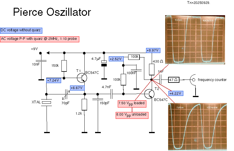T2 macht in dieser Schaltung nicht viel, er entkoppelt nur den Oszillator von der Belastung durch den Frequenzzähler, wie man im Oszillogramm rechts unten sieht: hier ist der Emitter von T1 und der Emitter von T2 gezeigt. Diese Belastung erzeugt dann auch die unschöne Form des Ausgangssignals -- der Emitterwiderstand von T2 müsste kleiner sein, um das Koaxkabel zum Zähler schnell genug entladen zu können. Bei abgestecktem Frequenzzähler sind beide Signale praktisch identisch, wobei das T2 Emitter-Signal nicht ganz bis auf 9V hochkommt, weil die 0.6V der Basis-Emitter-Strecke fehlen.