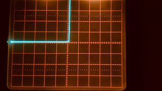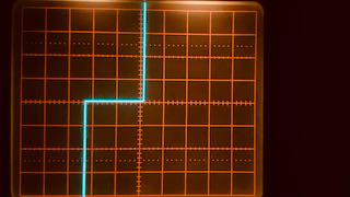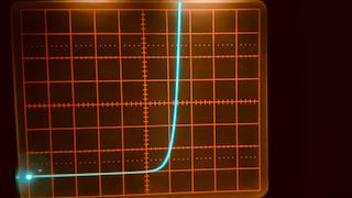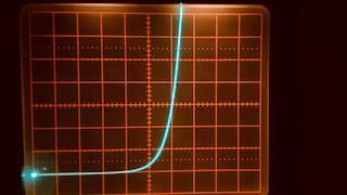 | Links die Kennlinie der Diode, rechts der Transistor. X-Empfindlichkeit ist 100 mV/cm und der Nullpunkt liegt ganz links. Man bemerkt zwei Unterschiede: (i) die Diode (eine 1N4148) beginnt schon knapp über 0.4 V zu leiten, während der Transistor etwas später, bei 0.55 V zu leiten beginnt. Ausserdem ist (ii) die Kennlinie des Transistors (BC547C) im leitenden Bereich deutlich steiler (wohl weil hier die Verstärkung des Transistors hilft). Aber beide Effekte sind für unsere Anwendung ohne Belang. Es muss also einen anderen Grund geben. |