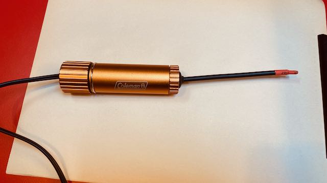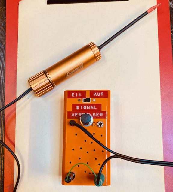 | Die ganze Probe ist sehr empfindlich auf Einstreuungen und muss daher in einem geerdeten Metallgehäuse untergebracht werden. Ich verwendete dazu das Aluminiumgehäuse einer defekten Coleman Taschenlampe (Batterien waren ausgelaufen und die Lauge hat alles zerfressen). Da das Gehäuse aus Aluminium ist, ist es sehr leicht und liegt gut in der Hand. Das Taschenlampengehäuse ist etwas dicker als die sonst oft verwendete Alu Entlötsaugpumpe; daher konnte ich die Elektronik auf einer Lochrasterplatine ohne Probleme aufbauen und im Inneren unterbringen. Als Verbindungskabel habe ich Stereo-Cinch-Leitung verwendet (die ist einzeln abgeschirmt) und dank des niedrigen Ausgangswiderstands kommt es trotz der nicht abgeschirmten Stecker zu keinen Brummeinstreuungen. |