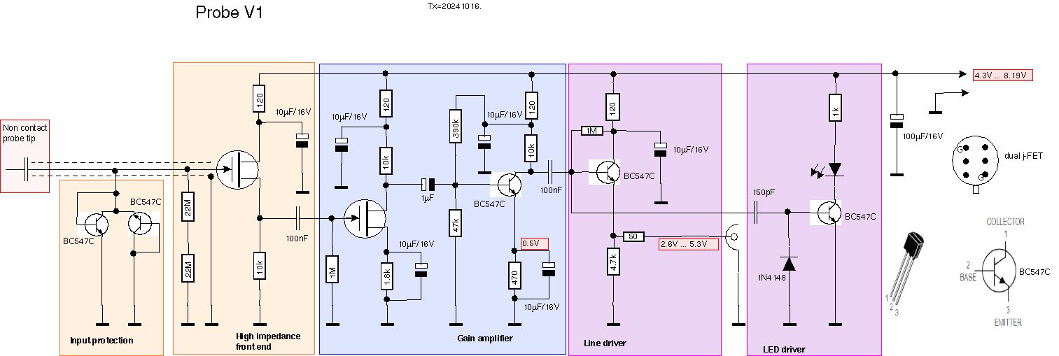 High impedance frontend (orange): Die erste Stufe wurde nun als Emitterfolger ausgeführt und bietet so einen hohen Eingangswiderstand. Dies sieht man, wenn man nur den kleinen Finger der Bananenbuchse annähert: schon bei einigen Millimetern Abstand koppelt 50Hz Brumm stark ein, obwohl der "Koppelkondensator" vermutlich um 1pF beträgt. Gain amplifier (blau): Der eigentliche Verstärker besteht nun nur noch aus zwei Transistoren, jedoch haben BC547C eine Stromverstärkung um 500 (gemessen), während die älteren 2N2926 nur auf 40 kommen. Die Verstärkung ist mit 250,000 trotzdem hier besser als die ca. 64,000 der älteren 3-Transistor-Schaltung. Power amplifier (violett): Aus der Endstufe habe ich den defekten Ausgangstrafo entfernt und dafür einen Emitterfolger verwendet, der einen niedrigen Ausgangswiderstand hat, sodass er den 8 Ohm Lautsprecher direkt treiben kann. Die Lautstärke ist nach wie vor nicht sehr hoch: ausreichend aber nicht laut. Über eine 3.5 mm Buchse kann man einen Kopfhörer anschliessen. Probe gain adjust (dunkelorange): Das 4.7k Poti ist von aussen zugänglich und stellt eine einstellbare Spannung zur Verfügung. Mehr dazu gleich. Ich war aber immer noch nicht ganz zufrieden damit und Mr. Carlson's Lab (MCL) inspirierte mich, das Projekt nochmal neu anzugehen: V3. MCL hat einen YouTube Kanal, den ich sehr gerne anschaue, aber die Bauanleitung für seine UltraProbe findet sich nur auf seinem kostenpflichtigen Patreon-Kanal (ist aber sehr preiswert und definitiv die paar Euro wert). MCL legt sehr grossen Wert auf sein Copyright und das ist sein gutes Recht. Dies ist kein direkter Nachbau seiner Schaltung, aber ich habe einige seiner Ideen aufgegriffen, was hoffentlich OK ist. MCL hat vor seinen Signalverfolger noch einen abgesetzten Vorverstärker geschaltet. Dieser ist sehr hochohmig und erlaubt so ein Abgreifen des Signals ohne direkten galvanischen Kontakt (non contact probe). Um dies zu erreichen, verwendet er einen Sperrschicht FET (j-FET) im Eingang. Ich hatte nur einen doppel j-FET in meiner Bastelkiste, also verwendete ich diesen. Das ist vermutlich Perlen vor die Säue, denn der war bestimmt einmal als Differenzverstärker gedacht gewesen, aber ich sehe nicht, dass ich ihn dafür in naher Zukunft verwenden würde, also besser hier als garnirgends. Die Bezeichnung ist leider nicht mehr lesbar.