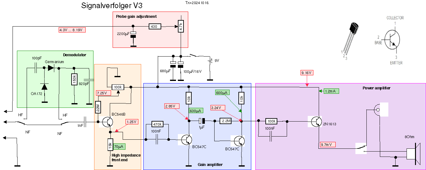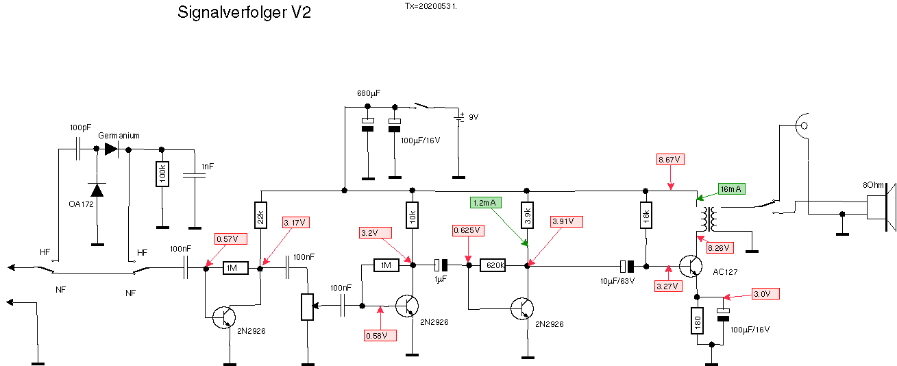Ich habe auch noch bei 64 mV (die kleinste Spannung, die mein Labornetzgerät liefern kann) gemessen: die Diode zeigt 5.4 nA (entspricht 12 MOhm, viel zu wenig) während ich den Strom des Transistors nicht mehr messen kann (also weniger als 100 pA), was einen Widerstand von mehr als 640 MOhm bedeutet -- absolut ausreichend. Diese Messungen beantworten auch die Frage, warum man Silizium-Dioden erfolgreich für die Demodulation von Radiosignalen einsetzen kann, sogar in einem Detektorempfänger, wo doch die Spannungen deutlich unter den 0.6 V der Diodenschwellenspannung liegen. Tatsächlich beginnt nämlich das "Knie" der Diode (siehe Bilder oben) nicht erst bei 0.4 V sondern schon mehr oder weniger am Ursprung, also bei einer Spannung von 0 V, sodass auch sehr schwache Signale erfolgreich demoduliert werden können. Gain amplifier (blau): Ein zweistufiger AC-gekoppelter Verstärker hebt den Signalpegel erheblich an. Dabei besteht die erste Stufe aus dem zweiten j-FET, weil er nun schon mal da war. Man könnte aber auch einen BC547C hier verwenden. Die RC-Kombinationen im Emitterkreis dienen der Arbeitspunktstabilisierung. Die 120 Ohm Widerstände im Kollektorkreis dienen der Entkopplung der Stufen um Rückkopplungen, die sich durch Blubbern (motor boating) bemerkbar machen, zu vermeiden. Da der nachfolgende Signalverfolger (siehe ganz oben) sowieso schon sehr empfindlich ist, muss der Pegel hier garnicht so groß werden. Line driver (violett): dieser Emitterfolger treibt mit seinem kleinen Ausgangswiderstand die abgeschirmte Leitung zum Signalverfolger. Der kleine Ausgangswiderstand schliesst auch erfolgreich Brummeinstreuungen ins Kabel und die (Bananen-) Stecker kurz. LED driver (violett): zusätzlich wird noch eine LED (high brightness, grün) über einen sehr kleinen Koppelkondensator und eine Gleichrichterdiode vom gain amplifier angesteuert. Diese LED blitzt einmal bei sehr starken Signalen, etwa wenn ein defektes Bauteil in einem Gerät rauscht oder kracht, durch die Gleichrichtung spricht sie aber auch auf HF an (etwa aus einem Oszillator in einem Radio), die man sonst nicht hören würde. Sehr schön sieht man das mit einer CFL Energiesparlampe (die ja intern einen Zerhacker hat, der bei ca. 30 kHz arbeitet, also nicht hörbar ist): nähert man die Probe-Spitze so einer Lampe bis auf 10 -- 20 cm, so brennt die LED voll, ohne dass man im Lautsprecher einen Ton hören würde. Die LED ist in der Probe montiert (hinten, wo das Verbindungskabel rausgeht), sodass man sie im Blick hat, wenn man mit der Probe in einem Gerät nach dem Defekt sucht. Die Betriebsspannung wird aus dem Signalverfolger entnommen. Der Strom ist mit ca. 1 mA sehr gering, sodass auf eine Stabilisierung mit einem LM1117 verzichtet wurde (der hätte selbst schon 5 mA verbraucht). Im Signalverfolger ist ein 4.7 kOhm Potentiometer, mit dem sich die Spannung auf 4.3 V bis 8.2 V einstellen lässt. Je höher die Betriebsspannung, umso besser die Verstärkung. So kann man also die Verstärkung bei starken Signalen zurückdrehen um eine Übersteuerung des Signalverfolgers zu vermeiden. Wichtig ist aber der 2200 |