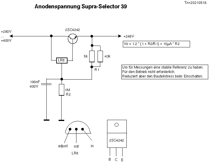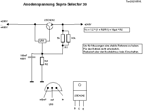 Um Probleme mit der Betriebsspannung auszuschliessen habe ich einen LR8-Regler mit einem Strom-Booster (2SC4242) eingebaut. Die 40mA der EL11 waren aber zu viel (der 2SC4242 wurde trotz Kühlblech zu heiß), sodass ich jetzt die EL11 (Trafo/Anode und Schirmgitter) sowie den Leuchtschirm des magischen Auges (soll möglichst hohe Spannung bekommen) aus der vollen Betriebsspannung (B++) versorge, den Rest aus der stabilisierten Betriebsspannung (B+, aktuell 245V). Diese Spannung ist jetzt rock-solid.