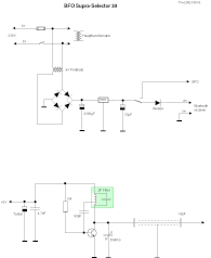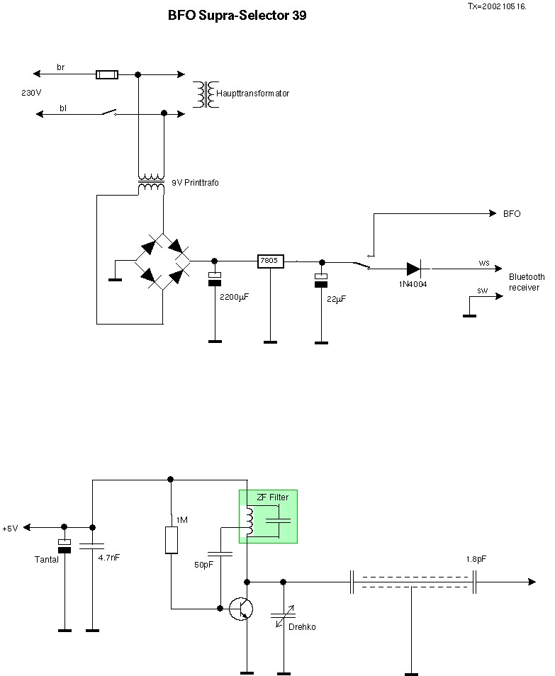 Zuerst betrieb ich ihn unstabilisiert an den gleichgerichteten 4V der Skalenlämpchen, denn die 6.3V der Röhrenheizungen liegen ja in der Mitte auf Masse und ich kann daher daraus keine massebezogenen 5V gewinnen. Ich habe dann einen kleinen Zusatztrafo eingebaut, um in der Wahl des Bezugspotentials frei zu sein. Ein 7805 stabilisiert die 5V. Ausserdem schalte ich bei BFO-Betrieb per Reed-Relais noch einen 1uF Kondensator (ungepolt) zur AGC-Spannung hinzu, damit diese träger wird und Sprechpausen bei SSB besser überbrückt. Die Einkopplung erfolgt über einen 1.8pF Kondensator direkt an der NF-Demodulationsdiode nach dem letzten ZF-Filter.