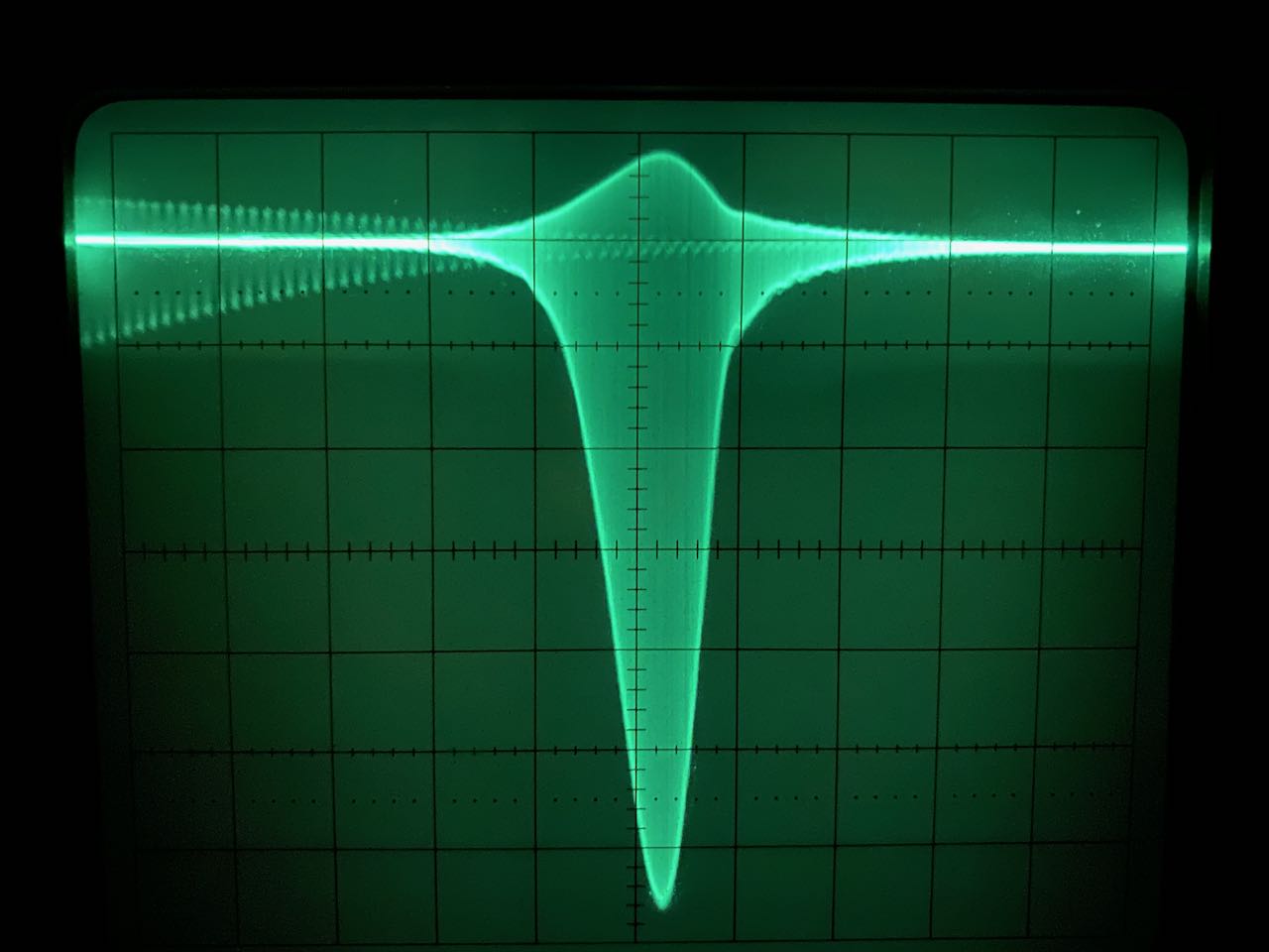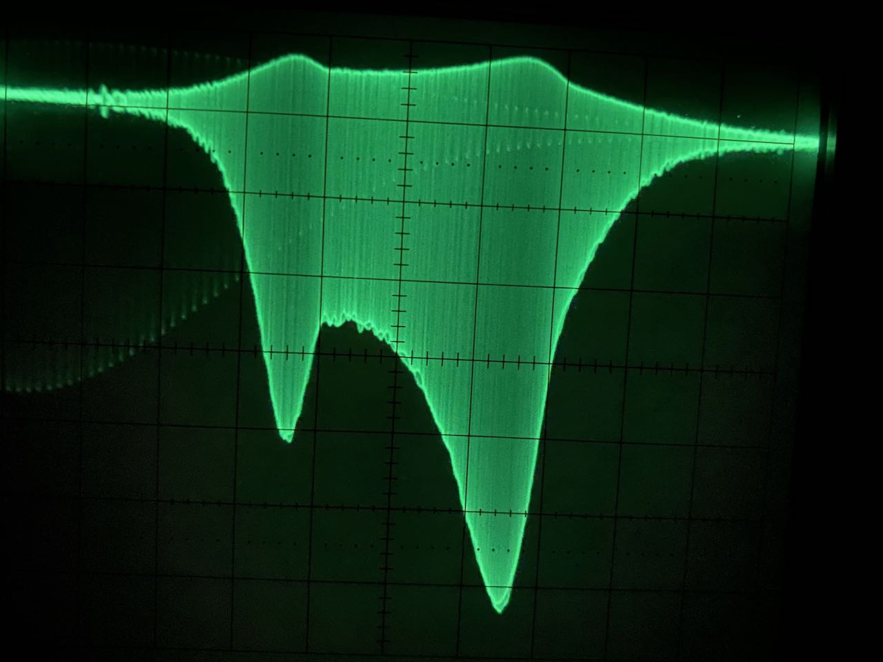 Durch die jeweils stärker werdende Kopplung der beiden Schwingkreise entsteht die typische Höckerstruktur der überkritischen Kopplung. Dabei werden die tiefen Audiofrequenzen (in der Mitte) etwas unterdrückt, was gewünscht ist. Nach oben hin, zu positiveren Spannungen, begrenzt die Audio-Diode der EBF11.