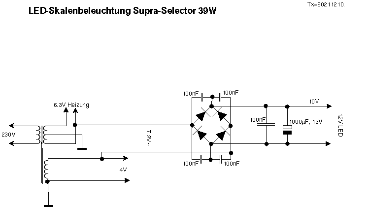 * Statt der mickrigen Skalenbeleuchtung habe ich einen 12V LED-Streifen unten am Skalenglas angeklebt (nach Entfernen der Lackschicht). Die Beleuchtung ist jetzt phantastisch! Die Zeigerposition ist nun überall leicht zu erkennen und die schöne Skala erstrahlt in warm-weissem Licht. Die Spannungsversorgung geschieht aus der 4V Wicklung für die Lampen (die nun abgeschaltet bleiben, was Trafo-Leistung spart) und einer Wicklung der 6.3V Heizungen (deren Anzapfung zur Brummunterdrückung auf Masse liegt).
