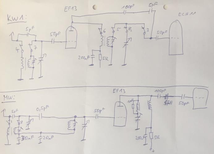 Bei KW1/KW2 dagegen ist ein Kreis vor der EF13, der andere nach der EF13 angeordnet. Interessant auch, dass hier nicht nur magnetisch gekoppelt wird, sondern jeweils über 5pF zusätzlich kapazitiv.