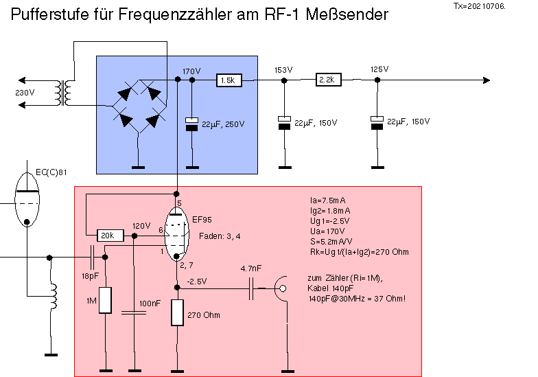 Der Zähler hat zwar einen Eingangswiderstand von 1 MOhm, jedoch schägt ein ausreichend langes RG58 Koax-Kabel mit 140pF zu Buche, was bei 30MHz nur noch 37 Ohm sind. Es muss also eine Pufferstufe her, die auf einen niedrigen Ausgangswiderstand arbeitet und ein vom Abschwächer in der Amplitude unabhängiges Signal ausreichender Stärke liefert. Ich habe mich für eine EF95 entschieden, weil ich davon noch einige hier habe und sie nur ca. 150mA Heizstrom braucht, was der Trafo im RF-1 schon noch verkraften wird. Sie arbeitet als Kathodenfolger, um den nötigen Strom liefern zu können. Im Schaltplan (nächstes Bild) ist das der rot hinterlegte Teil. Ich hatte auch versucht, an der Kathode der EC(C)81 auszukoppeln, jedoch ist dort die Amplitude zu klein und der Frequenzzähler steigt dann bei einigen Frequenzen aus und zeigt nichts mehr an.