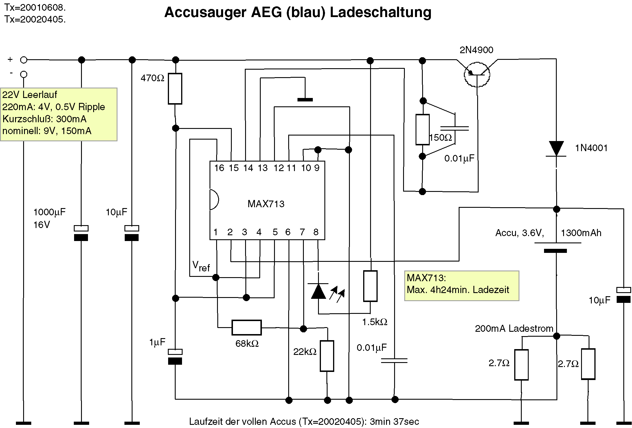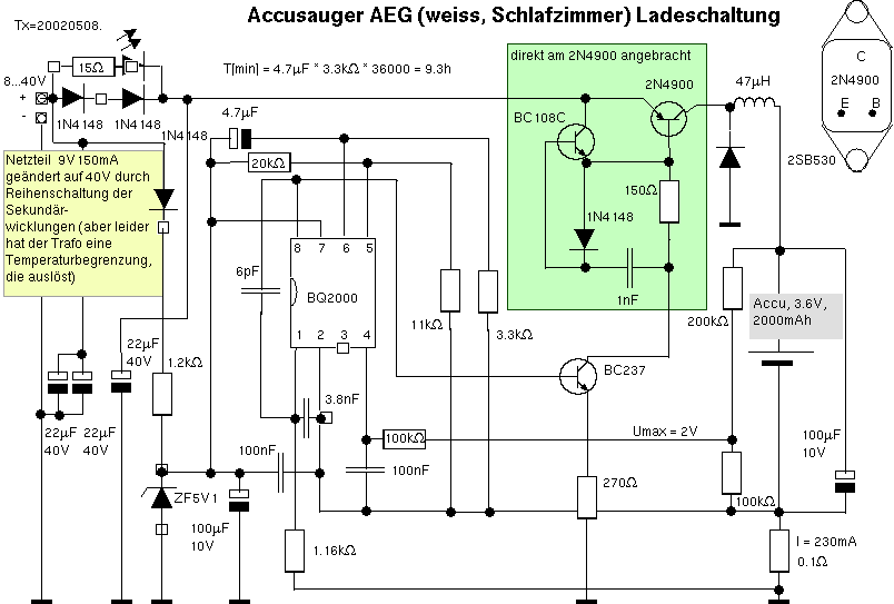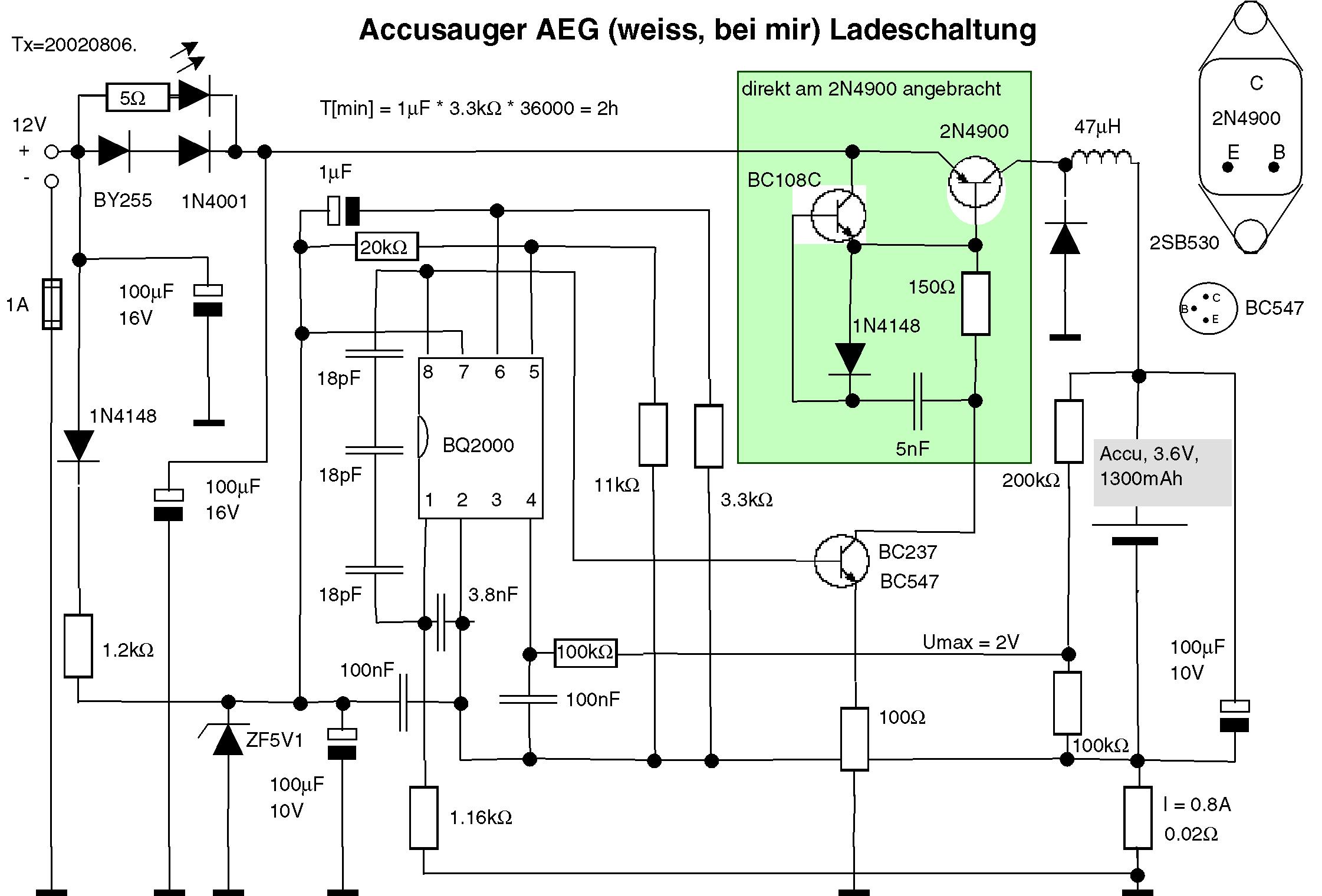 Eine bereits mehrfach erprobte Schaltung ist hier zu sehen. Da ein Schaltregler verwendet wird, bleibt zum einen die Erwärmung gering (kein Kühlkörper erforderlich), es wird kein unnötiger Strom verbraucht (Umwelt!) und man hat einen weiten Eingangsspannungsbereich (viele verschiedene Handy-Netzteile verwendbar) zur Verfügung. Alle Bauteile lassen sich leicht im Sauger selbst unterbringen. Das Schnelllade-IC BQ2000 schaltet nach Erreichen der Ladeschwelle zuerst auf top-off Ladung und dann auf Erhaltungsladung um. Ein Überladen des Akkus ist praktisch ausgeschlossen, was die Lebensdauer stark verlängert. Die LED im Sauger zeigt nun sehr schön den Ladezustand an: