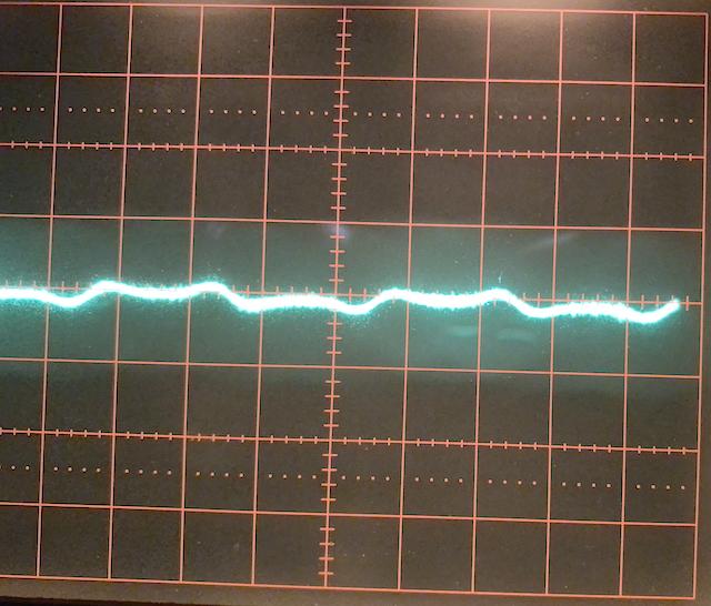 Es ist jetzt noch ca. 2 mVpp 50 Hz Brumm vorhanden, der sich aber nun ausfiltern lassen sollte. Im Bild sind es 5mV/cm.