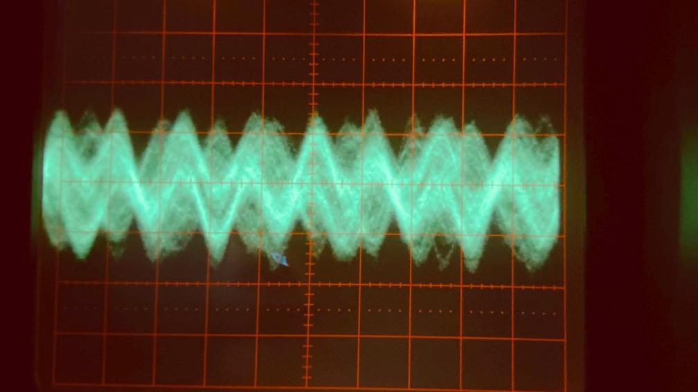 Ug = -2.2V, UA = 107.9V, Ua = 10000mVpp, V = 100, Phase = -90 deg., Ub = 352V (Maximum), Ia = 4.8mA, Frequenzteilung beginnt! Teilung durch 3