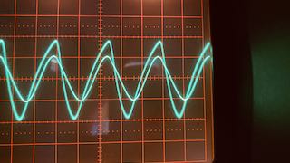 Ug = -1.3V, UA = 61.4V, Ua = 1000mVpp, V = 10, Phase = leicht negativ, "bump" im Input-Signal bei positiver Spitze des Output-Signals