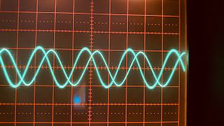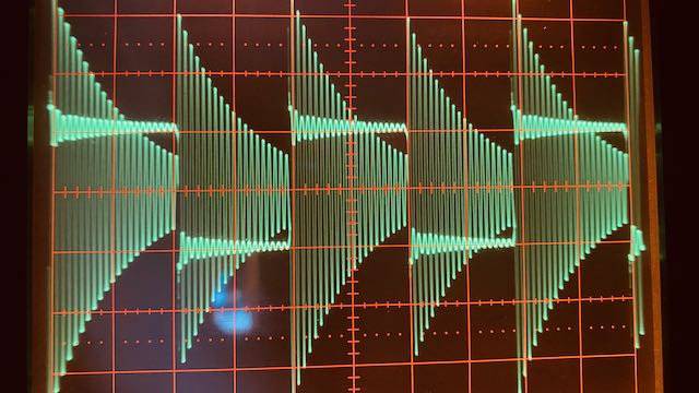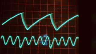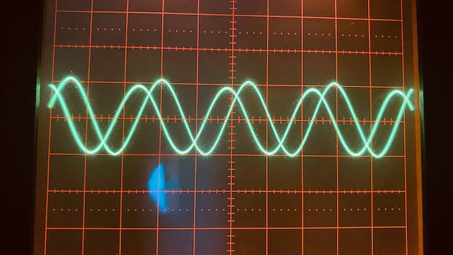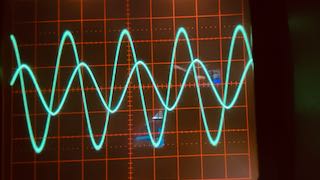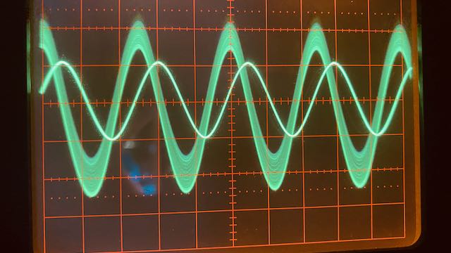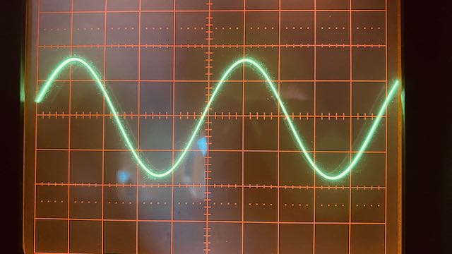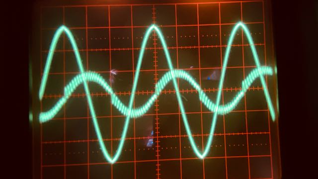 Anodenwiderstand schwingt der Oszillator auf einer viel niedrigeren Frequenz und mit einer verbrummten nicht-Sinus Kurvenform. Vermutlich eine parasitäre Kippschwingung. Grrr: der Widerstand hatte 1.8M