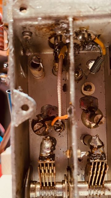 Am Eingang zum Radio liegt jetzt die Oszillatorschwingung mit über 1Vpp an, was das Radio völlig zustopft. Ich muss den Oszillator unterdrücken! Ausserdem streut 50Hz Brumm leicht von unten ein (in das Verbindungsstück ohne Schirmung). Ich sollte das mit einer Kupferfolie unterdrücken können. Habe ich mit Silberfolie gemacht, die über die Befestigungsschrauben des Tuners geerdet ist.
