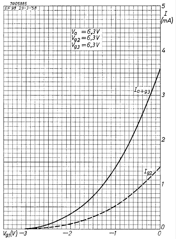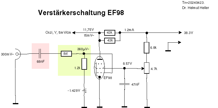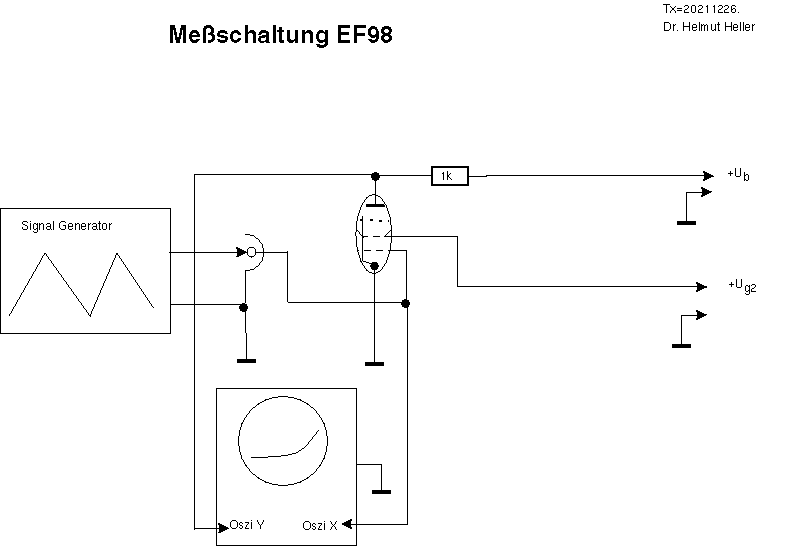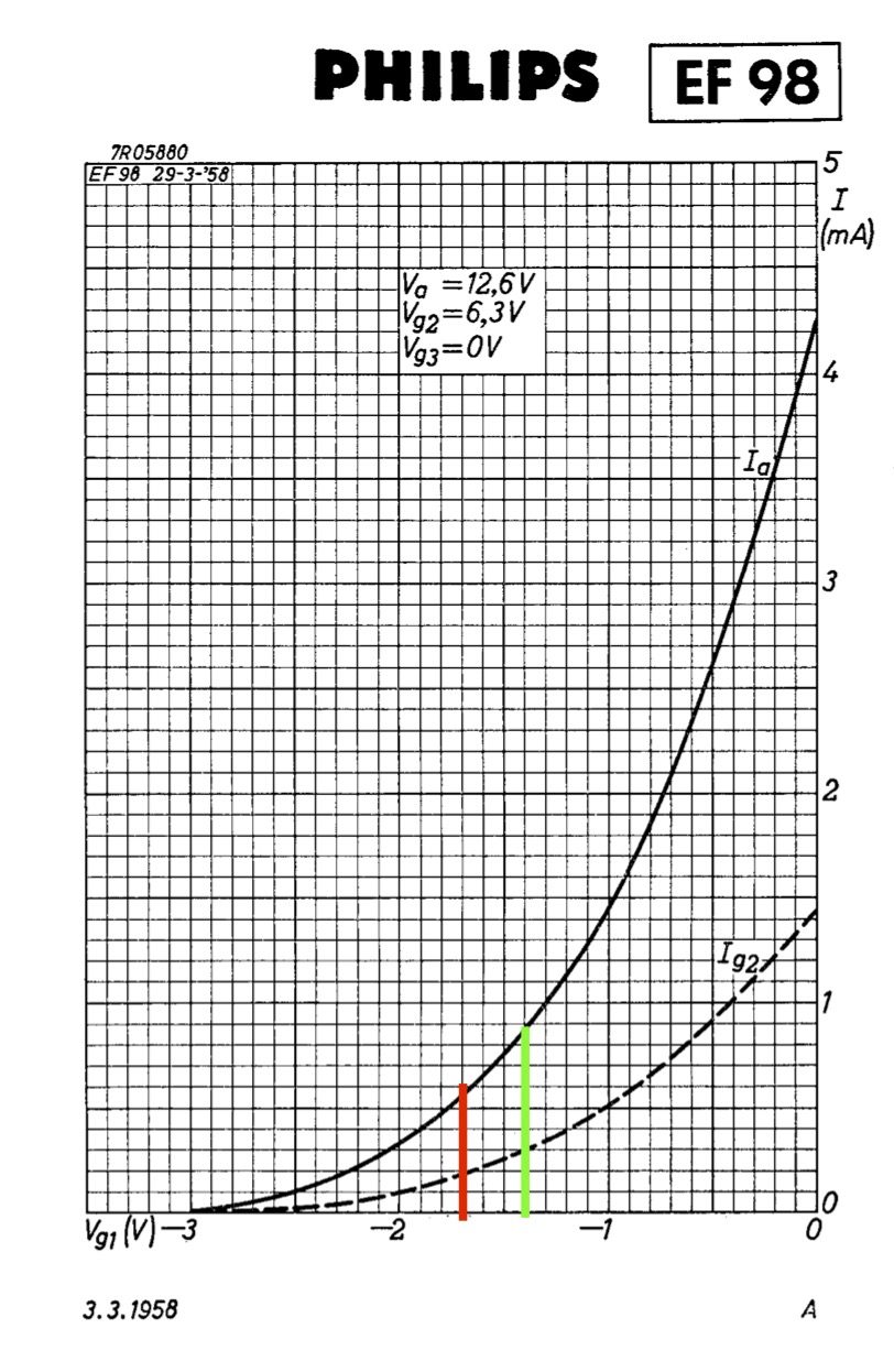 Ich habe mir die EF98 nochmals zur Brust genommen und untersucht. Während fast alles von oben reproduziert wurde, muss ich zum Arbeitspunkt meine Aussagen vervollständigen. Diesmal habe ich mit einer geringfügig anderen Schaltung gemessen: