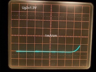 Links Ug2=15.9V, Ub=20.0V, mitte Ug2=15.9V, Ub=38.7V. Die Y-Skalierung ist 2mA/cm. Die beiden Kurven sind praktisch identisch. Bei Ug1= 0V liegt der Anodenstrom bei etwas über 7mA und damit fallen am 1k Messwiderstand ca. 7V ab, sodass links für die Anode noch 13V, mitte 31.7V übrig bleiben. Obwohl links das Schirmgitter ca. 3V positiver als die Anode ist, zeigt sich in der Kurve noch keine Veränderung. Rechts ist das Schirmgitter deutlich positiver als die Anode: Ug2=15.9V, Ub=4.4V. Man sieht einen Knick in der Anodenstromkennlinie bei ca. Ug1 = -1.7V: der inverse Betrieb .