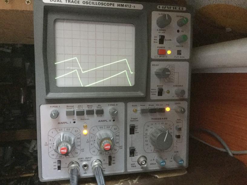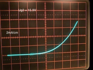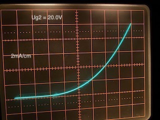 Ich benutze diesmal das Oszi im X-Y Betrieb und schreibe so die Messkurven direkt auf den Bildschirm. Die X-Ablenkung ist direkt die g1-Spannung und die Y-Ablenkung ist der Anodenstrom in mA/cm. Den Anodenstrom-Messwiderstand habe ich auf 1k erhöht, weil man dann leicht den Strom in mA auf dem Oszi ablesen kann. Das Signal kopple ich direkt am g1 ein (ohne Widerstand) und leite es auf das Oszi für die X-Ablenkung (ohne Kondensator, DC Kopplung). Die Spannung an der Anode wird jetzt (notgedrungen) gegen Masse gemessen; ich invertiere daher den Kanal-1 (Y) am Oszi und verwende die AC-Kopplung im Oszi. In X-Richtung habe ich 1V/cm, in Y-Richtung 1V/cm oder 2V/cm. Diesmal kann ich auch die absolute g1-Spannung direkt am Oszi ablesen. Nun kann ich die Steigung (die Ableitung), genannt die Steilheit (Domi bemerkte, wie sinnig die Bezeichnung "Steilheit" für die Ableitung der Kurve ist, he he) der Röhre in mA/V, direkt am Oszi ablesen, da X in Volt und Y in mA (oder 2mA) pro cm anzeigt. Am Signalgenerator verschiebe ich den Sägezahn durch DC-offset in den negativen Bereich (Gitter g1 Vorspannung). Eine Frequenz von 300 Hz reicht völlig, um ein flimmerfreies Bild zu bekommen.