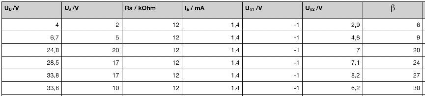 In der Tabelle ist jeweils die Schirmgitterspannung angegeben, die die grösste Verstärkung ergibt.