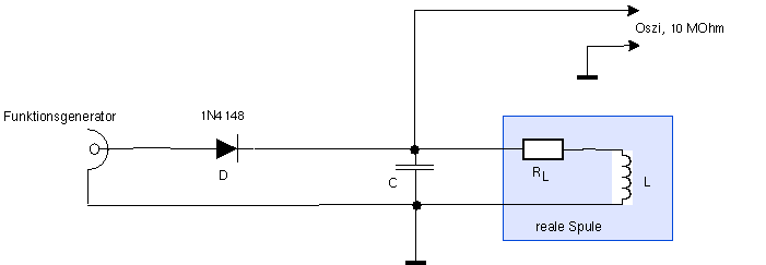 Die Diode entkoppelt Schwingkreis und Funktionsgenerator, der mit einer Rechteckschwingung niedriger Frequenz (z.B. 41 Hz damit das Bild nicht flackert) und mit einem Tastverhältnis, das dem Schwingkreis genug Zeit zum Ausschwingen gibt (also eine lange LOW Phase und nur eine kurze HIGH Phase, etwa 9:1), den Schwingkreis periodisch anregt. Während der HIGH Phase prägen wir der Spule einen gewissen Strom I ein (die absolute Größe spielt keine Rolle). Schaltet der Funktionsgenerator auf LOW, so müssen wir ihn vom Schwingkreis trennen, weil er diesen sonst viel zu stark belasten würde. Das machen wir mit der Diode D: diese sperrt (und wird hochohmig) sobald der Funktionsgenerator auf LOW schaltet (wir können am Funktionsgenerator auch noch zusätzlich einen kleinen negativen DC-Offset einstellen, um die Diode schnell und sicher sperren zu lassen). Als Drehkondensator können wir wieder das QM-1 verwenden, jedoch sollte es abgeschaltet sein (alle Röhren kalt).  Die beiden Low-Anschlussklemmen werden hier mit einem Draht direkt verbunden, sodass der padding Kondensator aus der Schaltung entfernt wird.