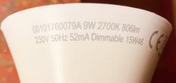 So kam auch diese 9W Toshiba LED Lampe Typ 15W46 zu mir. Sie war im Gang bei meinem Sohn eingesetzt gewesen, also eher kurze Brenndauern, dafür häufiges Ein- und Ausschalten. Das Symptom: brennt normal, geht dann kurz aus und gleich wieder an. Manchmal auch ein Blinken (oder Flackern). Fehler tritt nur manchmal auf, kann Stunden ohne Probleme laufen.