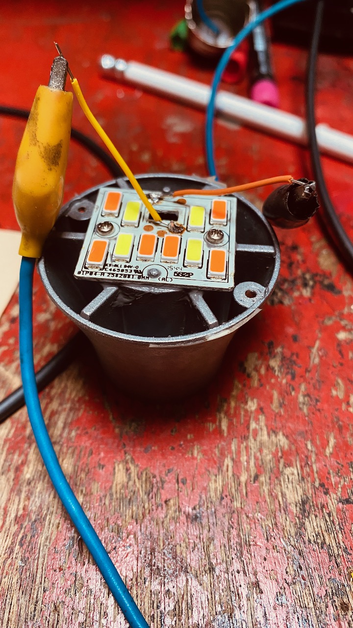 Mein erster Verdacht: die LEDs! Vielleicht ein Bonddraht, der sich gelöst hat. Also alle LEDs einzeln geprüft (am Niederspannungsnetzteil mit 30mA): alle leuchten. Auch interessant: 4 LED Chips haben offenbar intern 4 LEDs, die anderen 6 Chips haben 5 interne LEDs. Man kann das auch sehen, wenn man genau hinschaut. Aber