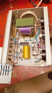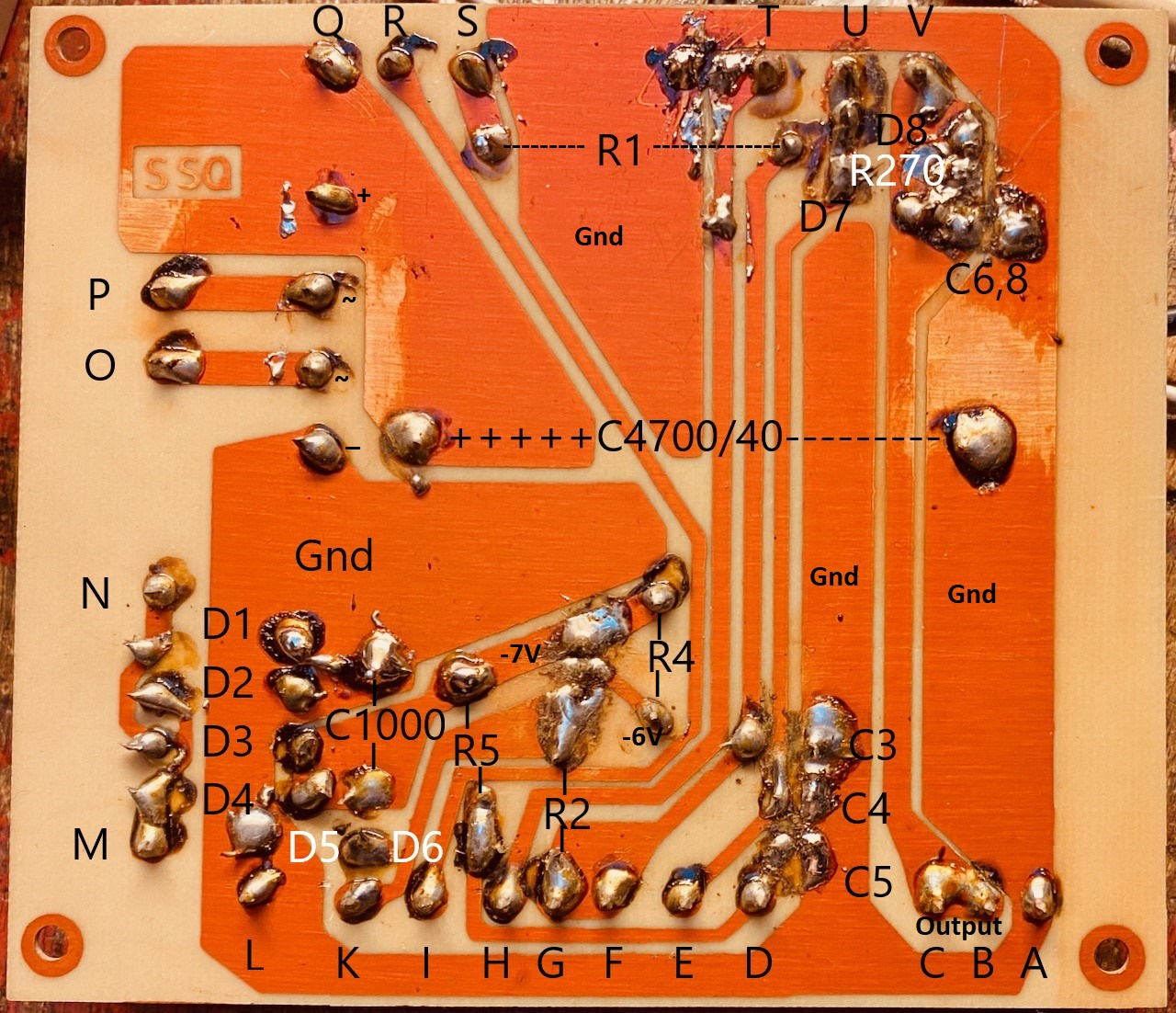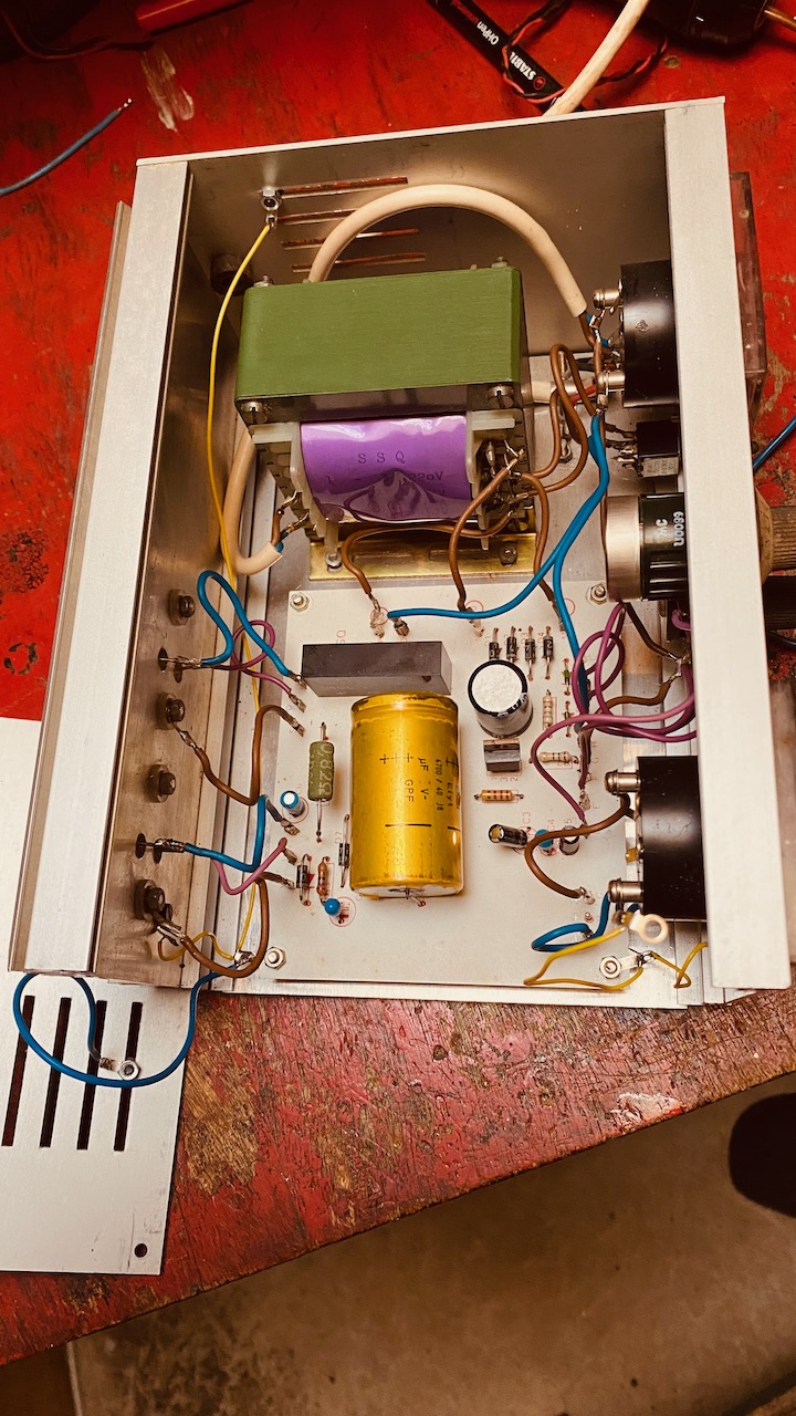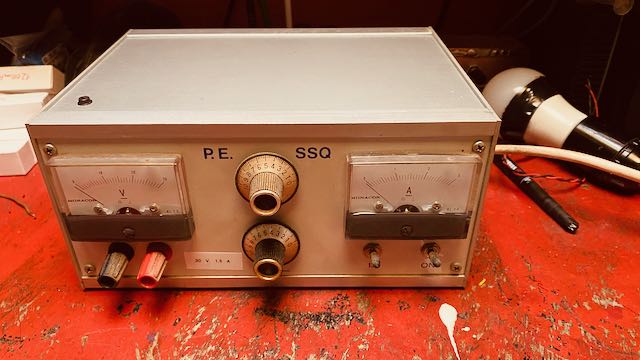 Unter den Sachen im "Nachlass" war auch dieses Netzteil. Ein Bausatz, offensichtlich. Leider waren im Internet keine Unterlagen (Schaltplan) dazu zu finden -- die Herstellerfirma SSQ hat wohl nicht bis ins Internetzeitalter überlebt. Ich habe daher versucht, den Schaltplan nachzuzeichnen. Es kann aber gut sein, dass sich hier der eine oder andere Fehler eingeschlichen hat.