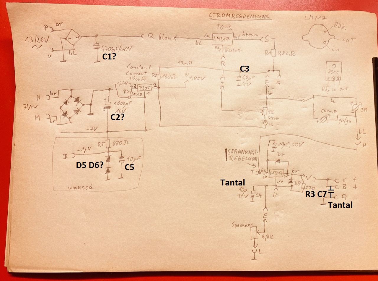 Als ich das Gerät bekam, hat es nicht (mehr) funktioniert, denn es war wohl schon einige Jahre nicht mehr benutzt worden. Tatsächlich waren zwei Tantal-Kondensatoren defekt, die ich gewechselt habe. Da das Amperemeter bis 3A geht, dachte ich zuerst, dass die beiden LM317 parallel geschaltet sind ( 2 x 1.5 A = 3 A), was aber nicht der Fall ist, wie sich nach dem Zeichnen des Schaltplans herausstellte. Auch gaben einige der Steckverbindungen keinen Kontakt mehr, die Federkraft war erlahmt. Ich denke, dass einer der Tantal Elkos starb, weil bei Einsetzen der Strombegrenzung ohne Last (Poti einfach ganz herunterdrehen) die Ausgangsspannung auf -4V geht! Das mögen die Tantals garnicht.