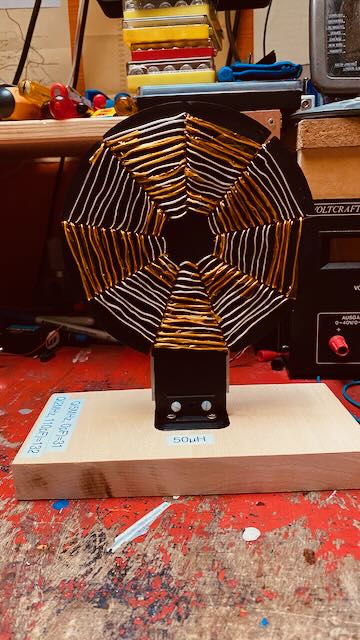 Während des Wickelns prüften wir immer wieder die Induktivität: der innere Durchmesser beträgt 3cm, der äußere Durchmesser 15cm und die Induktivität stieg innen von Windung zu Windung nur sehr wenig an. Den größten Induktivitätsgewinn erzielten wir in den äußeren Windungen. So erreichte ich die gewünschten L=50