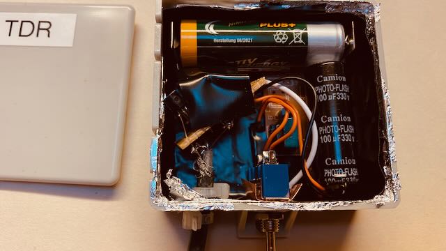 Ich habe meine Metallgehäuse leider nicht gefunden, sodass ich ein Plastikgehäuse verwendet habe, das ich aber mit Aluminiumfolie ausgekleidet habe, damit nichts einstreut und vor allem auch keine Impulse das Gehäuse unerlaubt verlassen. Damit es zu keinen Kurzschüssen kommt, habe ich innen die Alufolie mit Isolierband isoliert.