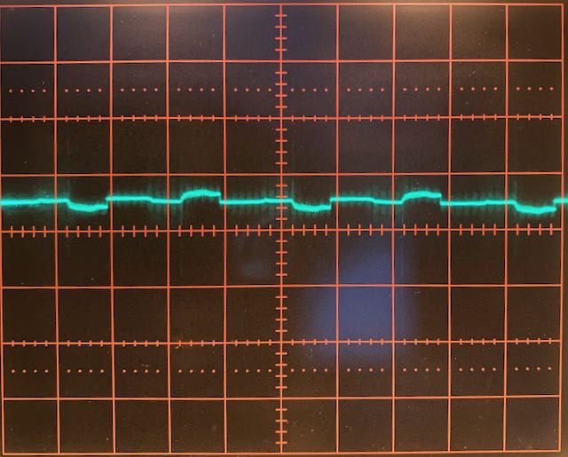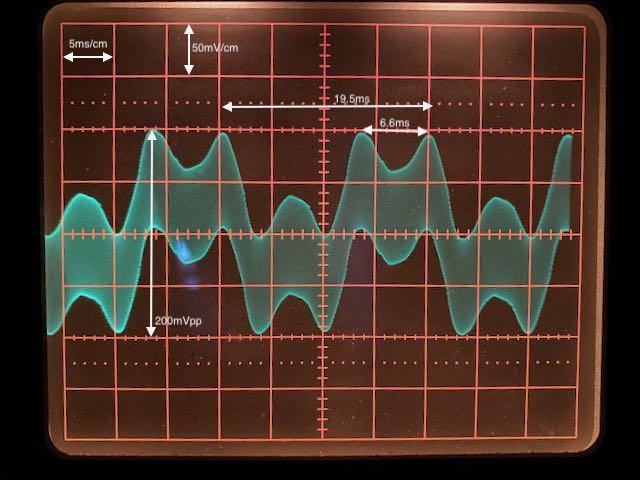 Der 17.2kHz Schwingung, die als grünes Band mit einer Amplitude von 100mVpp sichtbar ist, ist eine niederfrequente Schwingung überlagert, sprich ein Brumm! Dabei ist die höchste Frequenz 1/6.6ms = 150Hz, aber auch die Grundschwingung von 19.5ms, also 50Hz ist deutlich sichtbar. Hierbei handelt es sich um Netzbrumm, denn die Triggerung des Oszi erfolgte mit der Netzfrequenz und dieses Bild ist damit phasenstarr verkoppelt. Die 150Hz sind natürlich die 3. Harmonische der Netzfrequenz (1. Harmonische = Grundton von 50Hz). Die 3. Harmonische wird vor allem von nicht PFC-korrigierten Schaltnetzteilen erzeugt. Und davon gibt es bei mir einige!