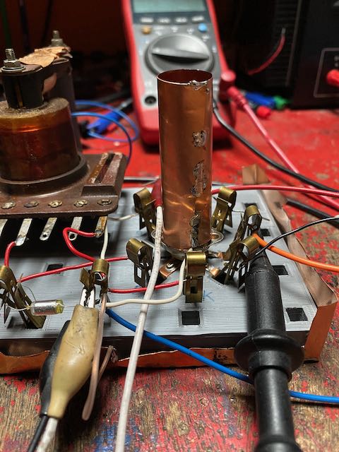 Bei diesem Versuch zeigte sich jedoch eine starke Handempfindlichkeit der EF98: sobald ich die Hand der Röhre nähere, steigt die Amplitude stark an! Berühre ich die Röhre im Bereich der Elektroden (also an der flachen Seite), wird eine sehr starke 50Hz Einstreuung beobachtet. Dies verwundert, da die EF98 einen Schirm besitzt, der innen direkt mit der Kathode verbunden ist und externe elektrische Felder eigentlich abschirmen sollte. Um diese Einstreuungen zu unterbinden, habe ich die EF98 mit einer Kupferabschirmung versehen, die mit dem Masse-Sternpunkt verbunden ist.