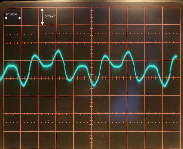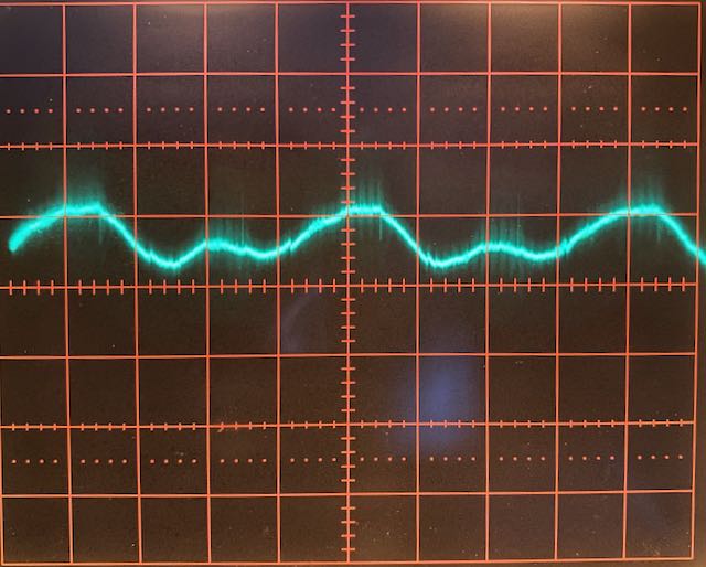 Klemme ich die Heizung am (laufenden) Trafo ab, so geht der Brumm nach Abkühlen der Röhre stark zurück und sieht so aus: