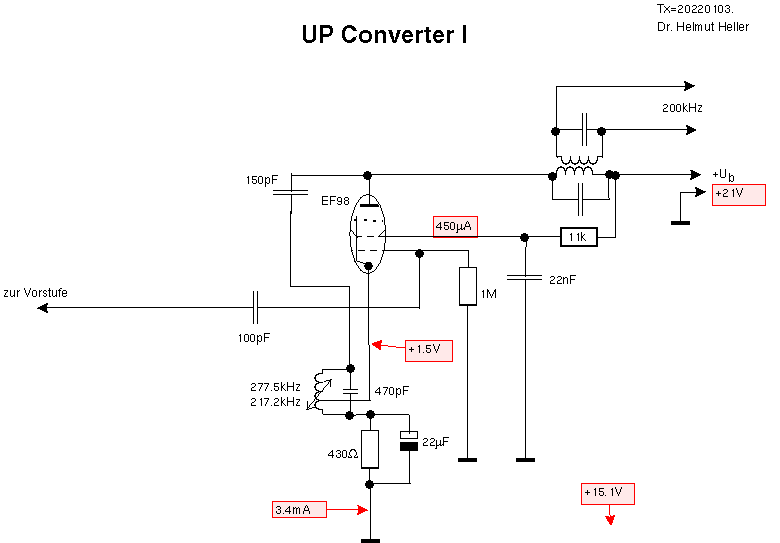 Durch Rückkopplung von der Anode zur Kathode schwingt die Schaltung auf der Nutzfrequenz f0 aber um 200kHz höher, also fo = f0 + 200kHz. Die Differenzfrequenz mit der Nutzfrequenz liefert dann ein Signal bei 200kHz: fo - f0 = 200kHz, das im Langwellenempfänger hörbar gemacht wird. Als Resonator dient ein altes ZF-Filter aus einem zerlegten Transistorradio, dessen Kreiskapazität vergrößert wurde.